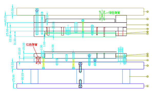 3.復(fù)合模外脫料板用紅色彈簧,內(nèi)脫料板用綠色或棕色彈簧.