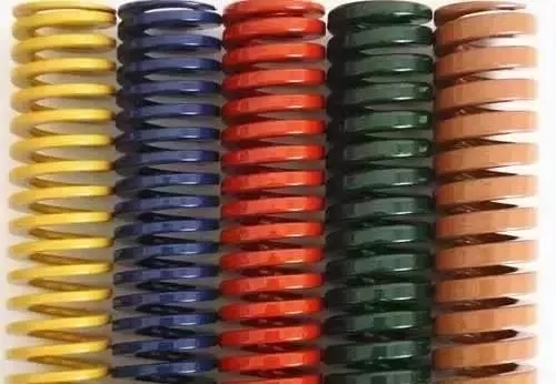 彈簧是模具中廣泛應(yīng)用的彈性零件,主要用于卸料、壓料、推件和頂出等工作.根據(jù)荷重不同,共分五種不同顏色加以區(qū)分,易於判別和選用.